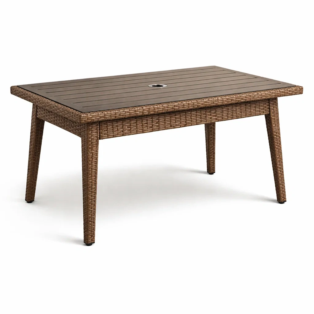 Ausgestattet mit einem Mittelloch für einen Sonnenschirm.